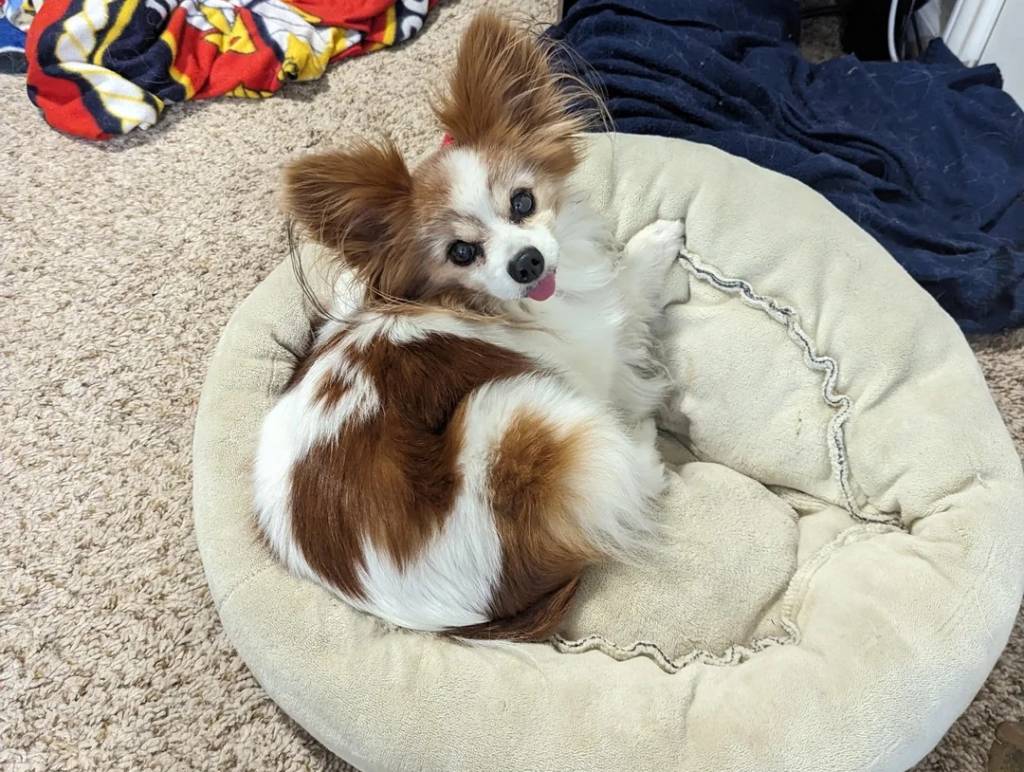 Un Épagneul Nain Continental Papillon allongé dans un panier et titant la langue