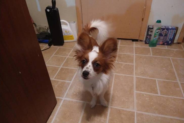 Un Épagneul Nain Continental Papillon sur un sol carrelé