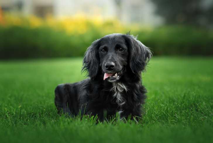 Un bel Epagneul Russe noir allongé dans l'herbe