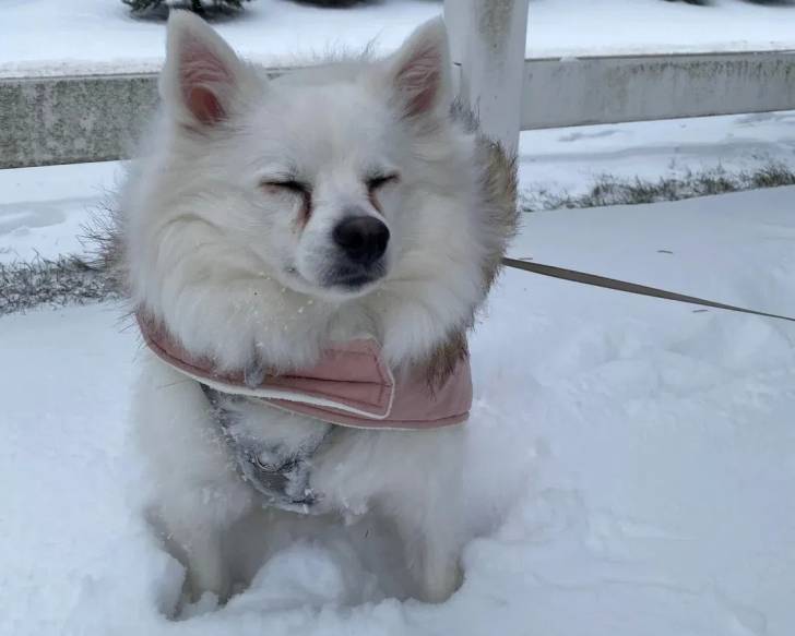Un Esquimau Américain assis sur une surface enneigée et qui est tenu en laisse