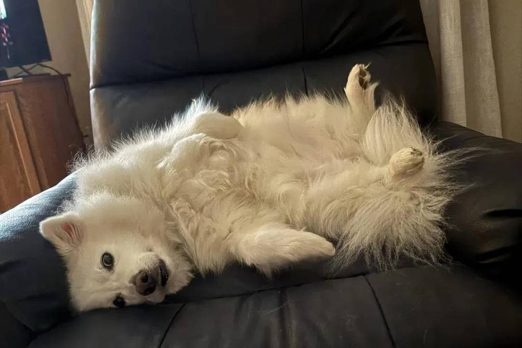 Un Esquimau Américain allongé sur un fauteuil et regardant vers la caméra