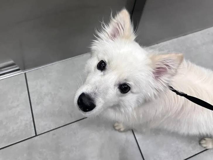 Un Esquimau Américain sur un sol carrelé et qui est tenu en laisse
