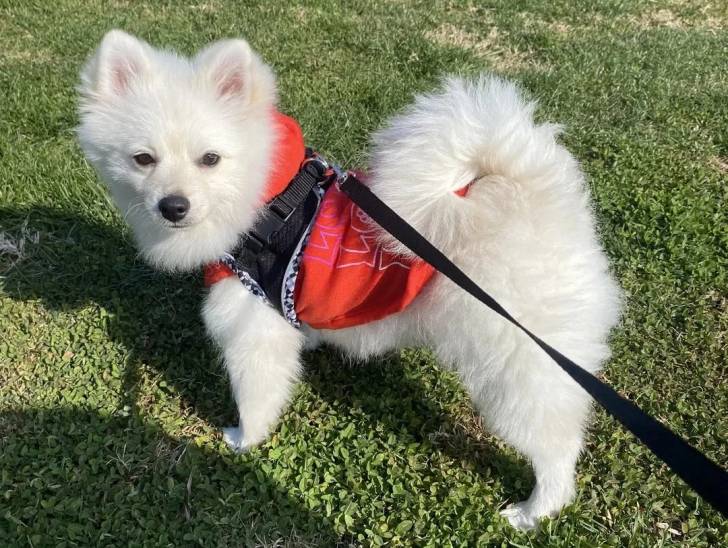 Un Esquimau Américain sur une surface herbacée et qui est tenu en laisse