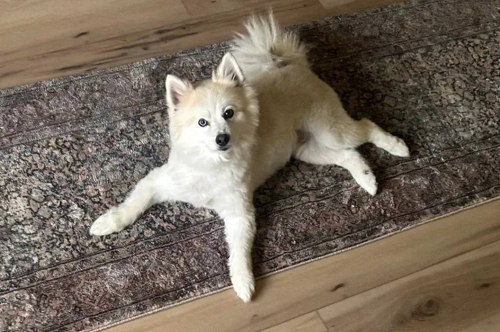 Un Esquimau Américain allongé sur un tapis et regardant vers la caméra