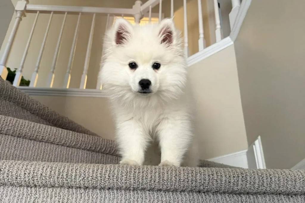 Un Esquimau Américain sur une marche d'escaliers et regardant vers la caméra
