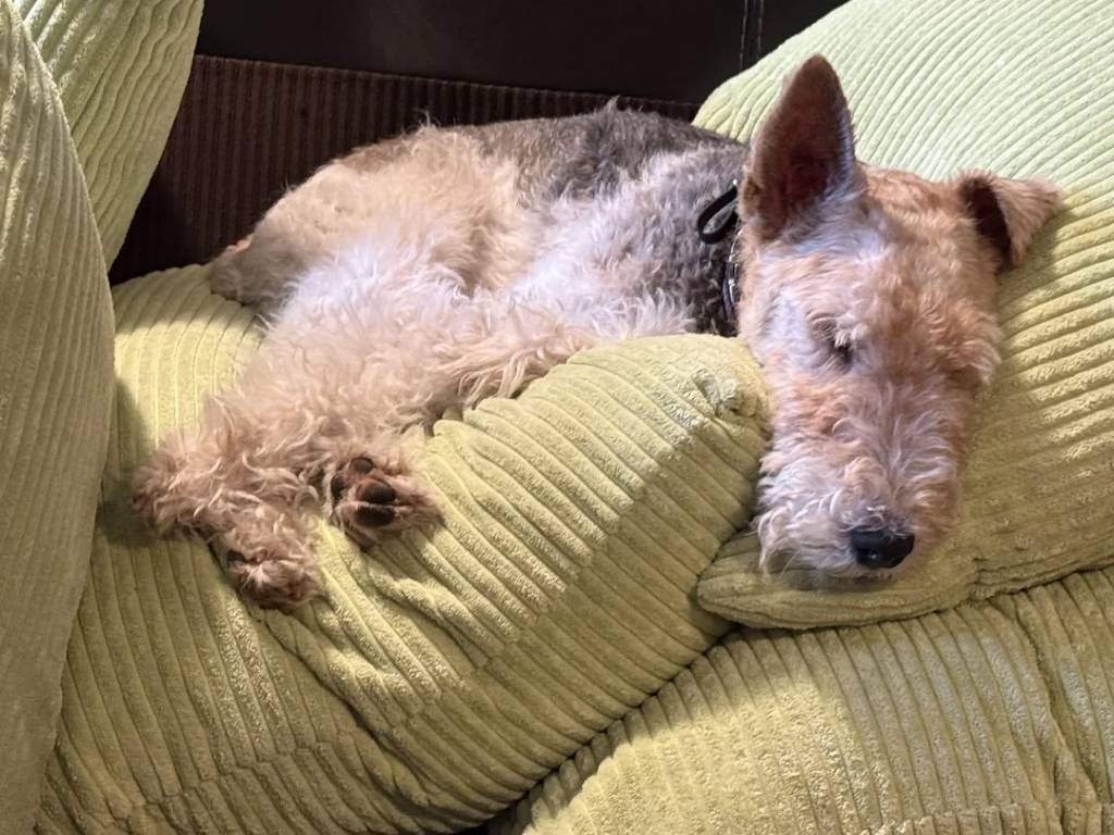 Un Fox Terrier à Poil Dur allongé sur un canapé et portant un collier autour du cou
