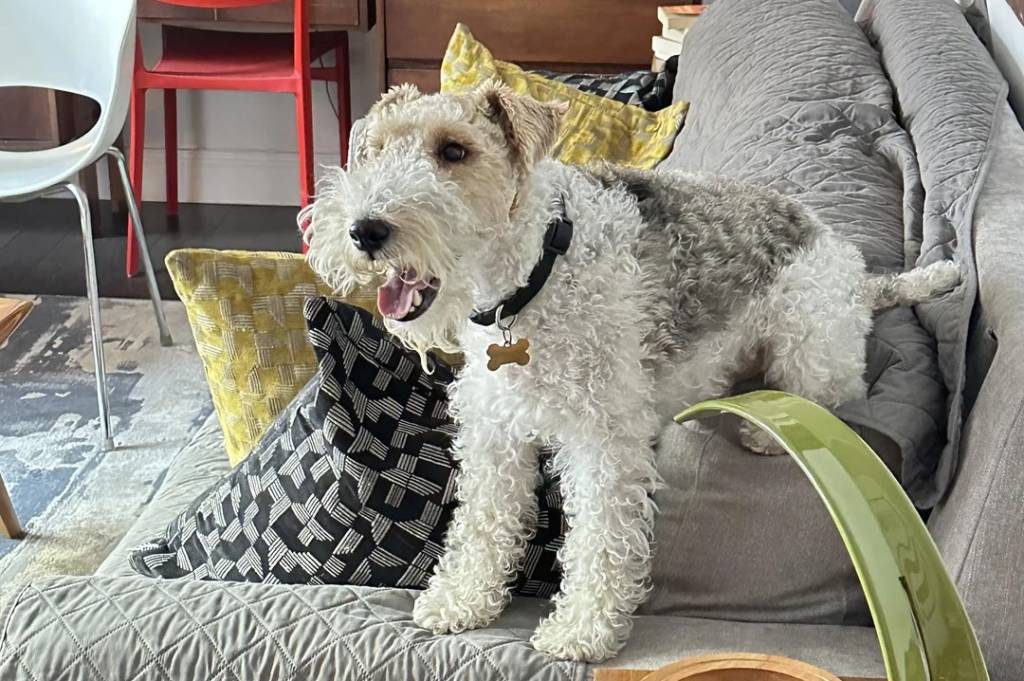 Un Fox Terrier à Poil Dur sur un canapé et portant un collier autour du cou