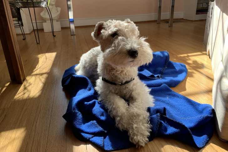 Un Fox Terrier à Poil Dur allongé sur un tapis et portant un harnais