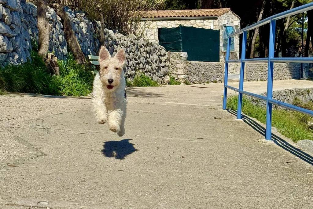 Un Fox Terrier à Poil Dur courant sur une surface bétonnée