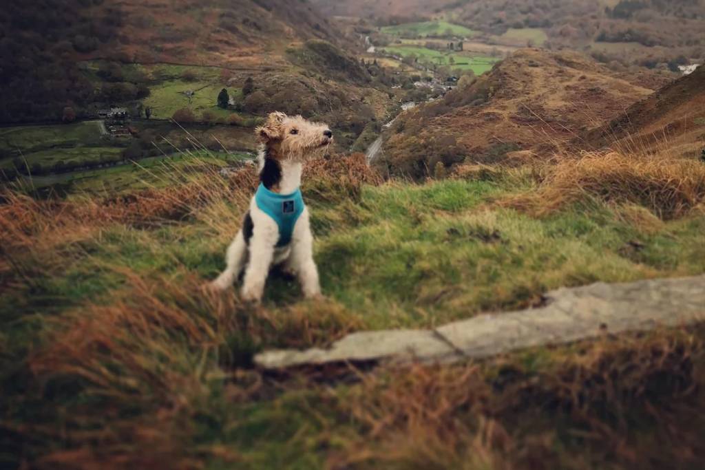 Un Fox Terrier à Poil Dur assis sur un terrain herbeux et portant un harnais