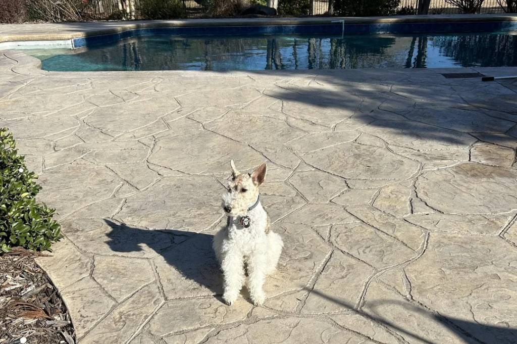 Un Fox Terrier à Poil Dur assis sur une surface bétonnée et portant un collier autour du cou