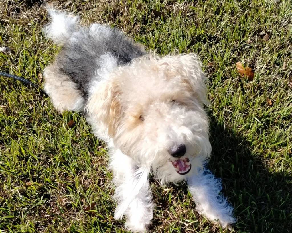 Un Fox Terrier à Poil Dur allongé sur une surface gazonnée