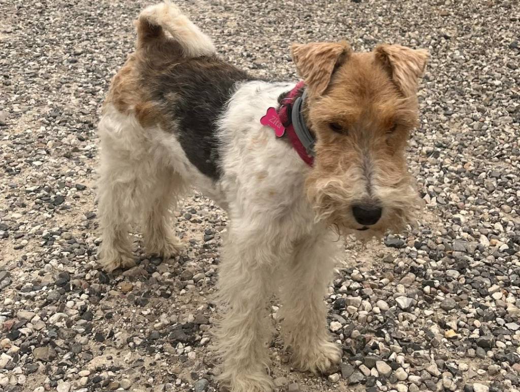 Un Fox Terrier à Poil Dur sur des gravillons et portant un collier autour du cou