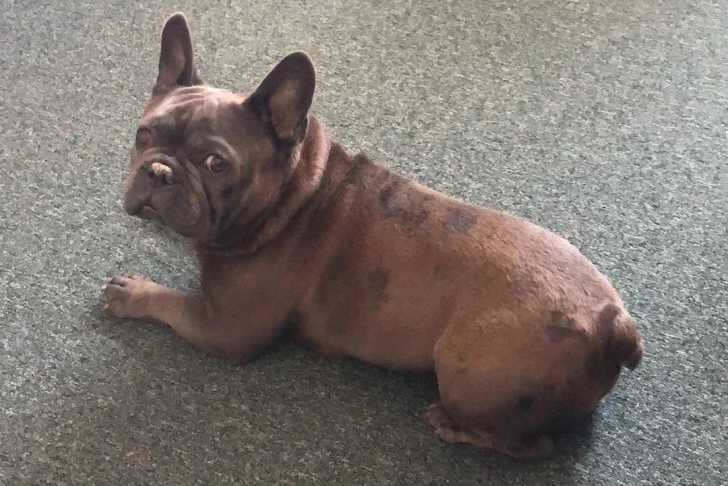 Un French Bullnese allongé sur une moquette et regardant vers la caméra