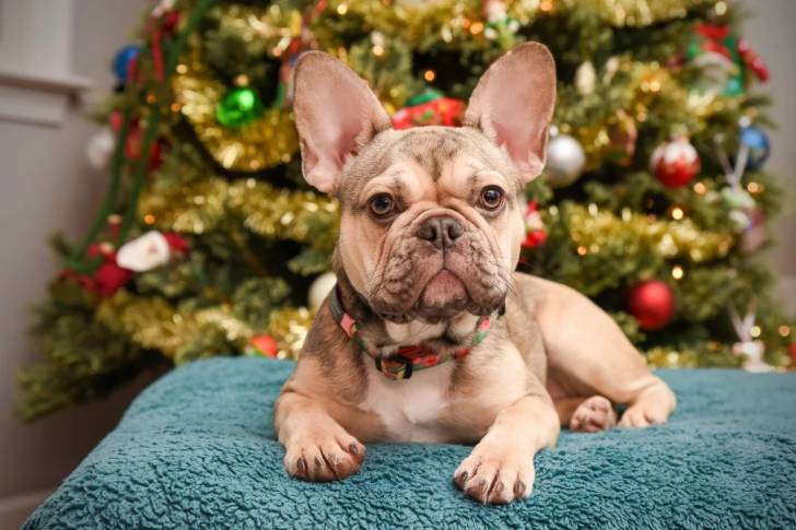 Un French Bullnese allongé et portant un collier autour du cou