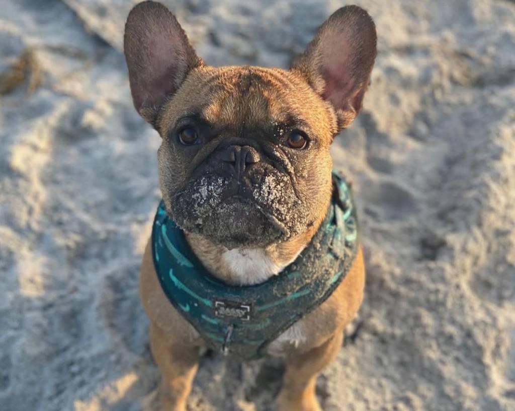 Un Frenchton assis sur une surface sableuse et portant un harnais