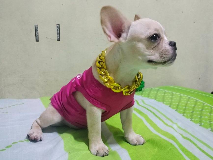 Un Frenchton assis sur un lit et portant un collier autour du cou