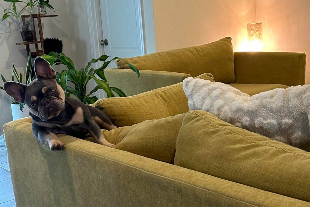 Un Frenchton allongé sur un canapé et semblant détendu