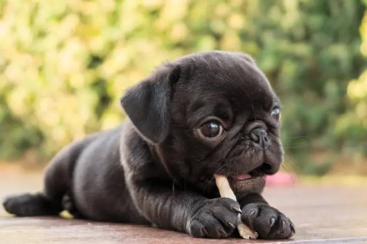 Un Frug noir allongé sur une terrasse en bois et mâchant un os