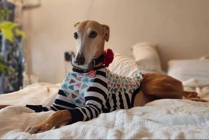 Un Galgo Espagnol allongé sur un lit et portant un habit pour chien