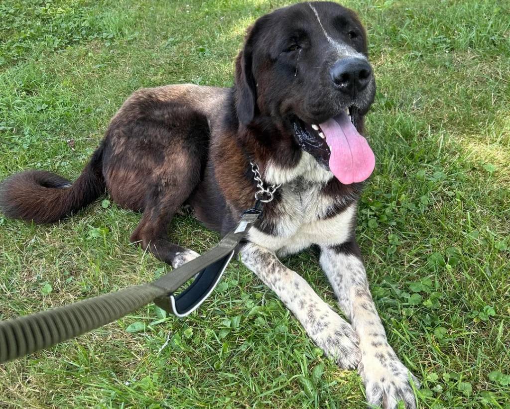 Un German Anatolian Shepherd ayant la langue pendante et qui est tenu en laisse