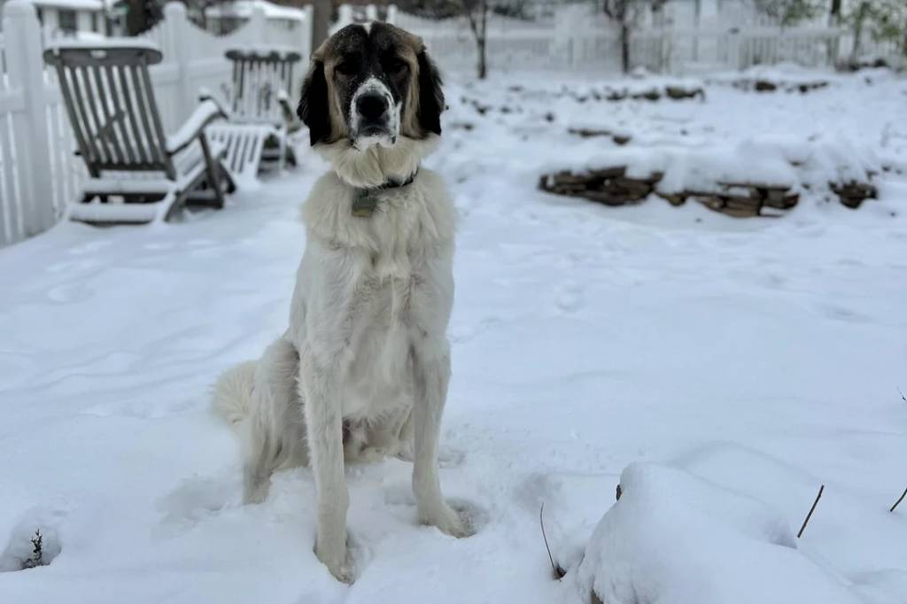 Un German Anatolian Shepherd assis sur une surface enneigée et portant un collier autour du cou