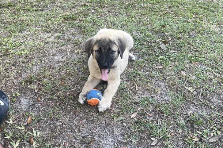 Un German Anatolian Shepherd ayant la langue pendante et regardant vers la caméra