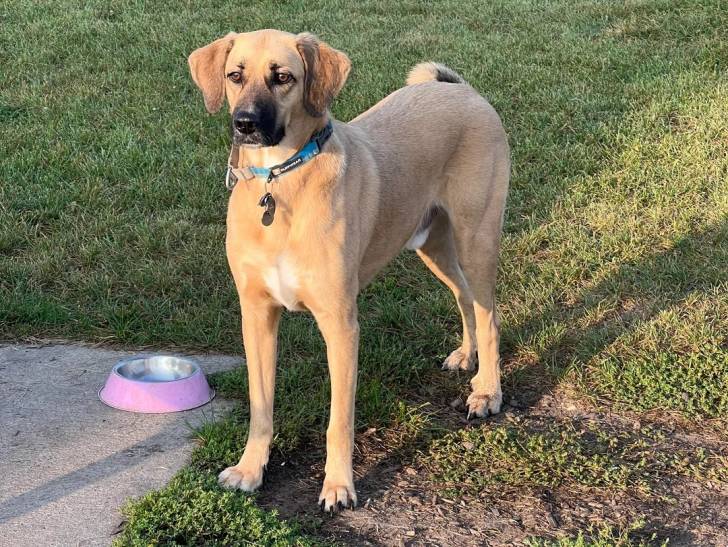 Un German Anatolian Shepherd sur une surface herbacée et portant un collier autour du cou