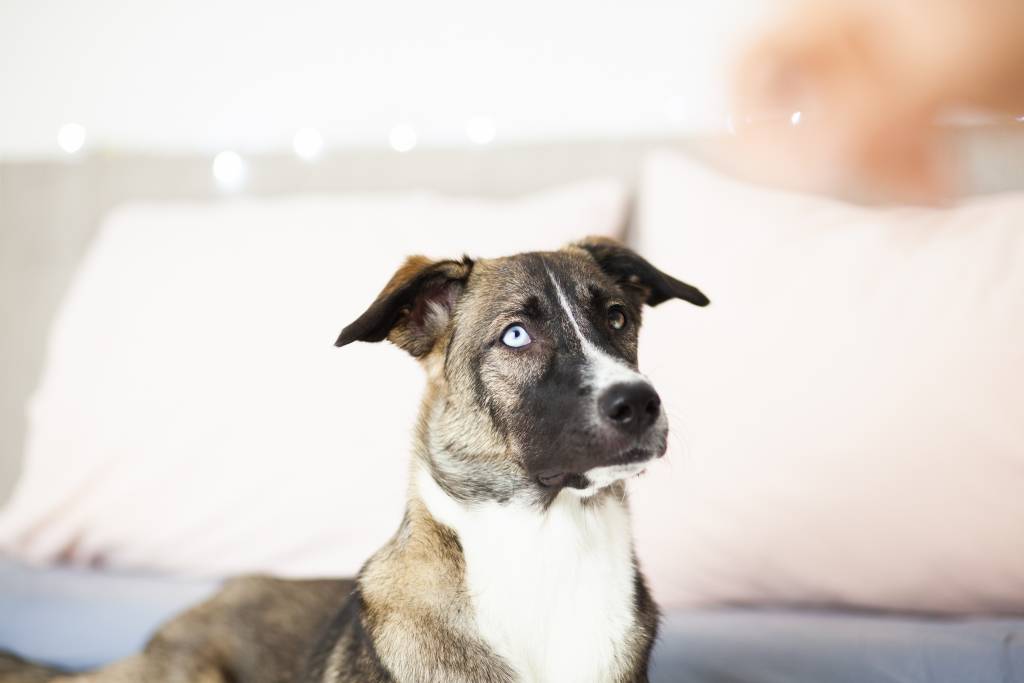 Un Goberian aux yeux vairons bleu et marron et au pelage tricolore blanc, fauve et noir
