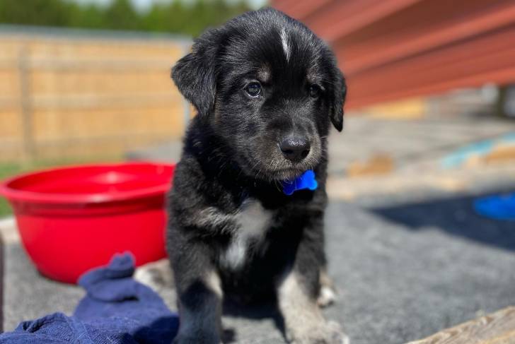 Un petit Goberian apprend à patienter pour recevoir son repas