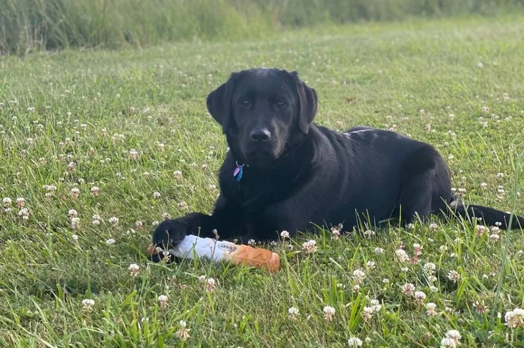 Un Goldador allongé sur un terrain herbeux et portant un collier autour du cou