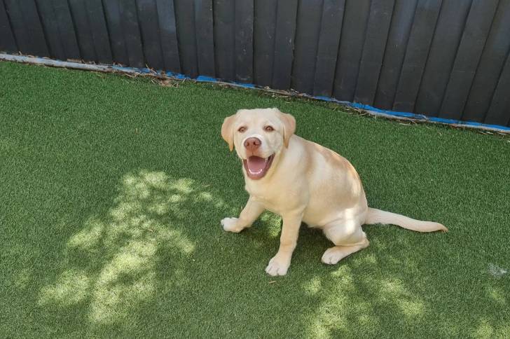 Un Goldador assis sur du gazon synthéthique et ayant la gueule légèrement ouverte