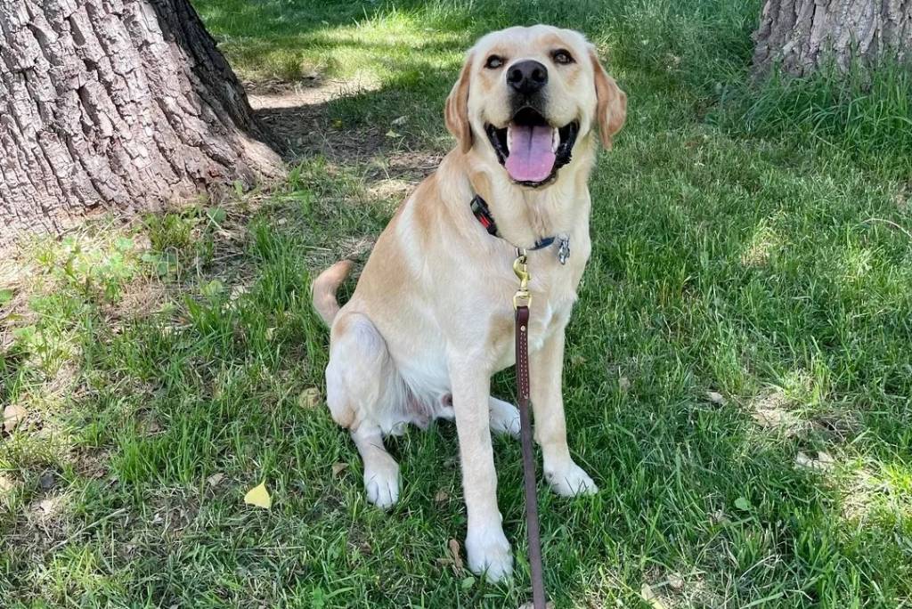 Un Goldador tirant la langue et qui est tenu en laisse