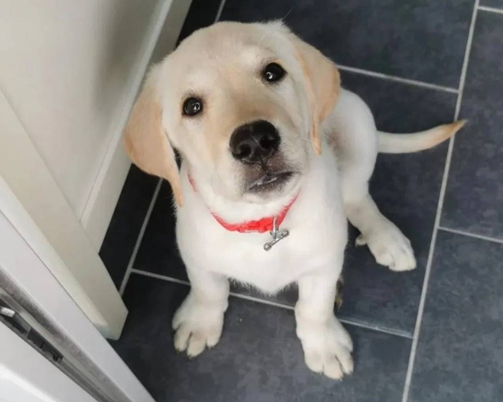 Un chiot Goldador assis sur un sol carrelé et portant un collier autour du cou