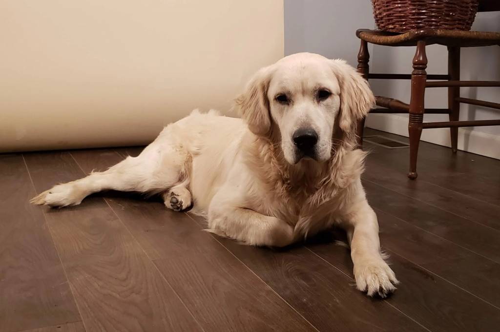 Un Goldador allongé sur un plancher et regardant vers la caméra