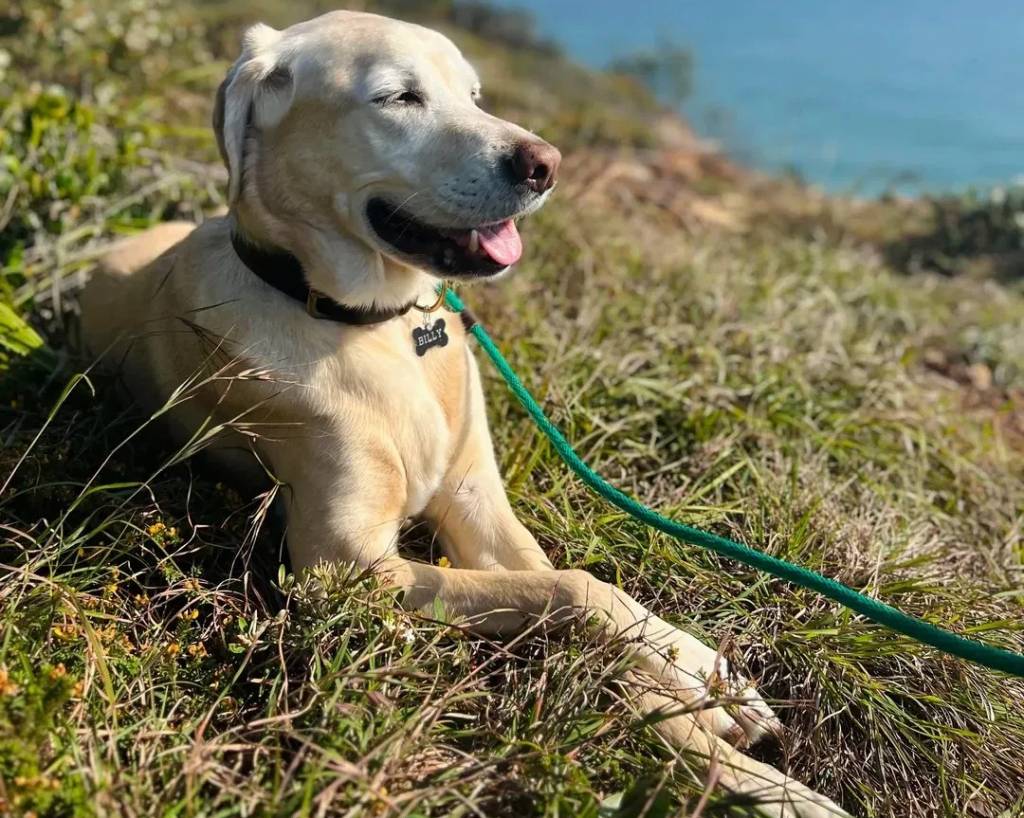 Un Goldador allongé sur un terrain herbeux et qui est tenu en laisse