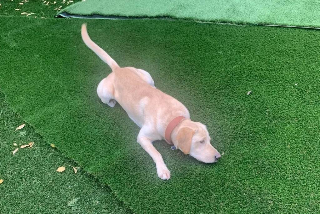 Un Goldador allongé sur du gazon synthétique et portant un collier autour du cou