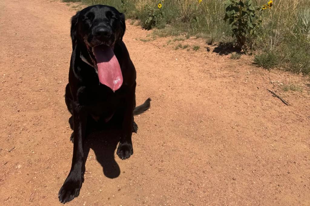 Un Goldador sur une surface sableuse et ayant la langue pendante