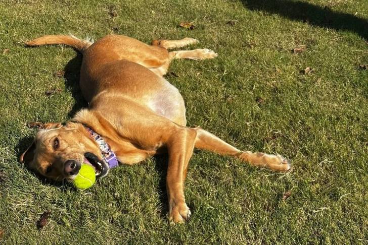 Un Goldador portant un collier autour du cou et ayant une balle de tennis dans sa gueule