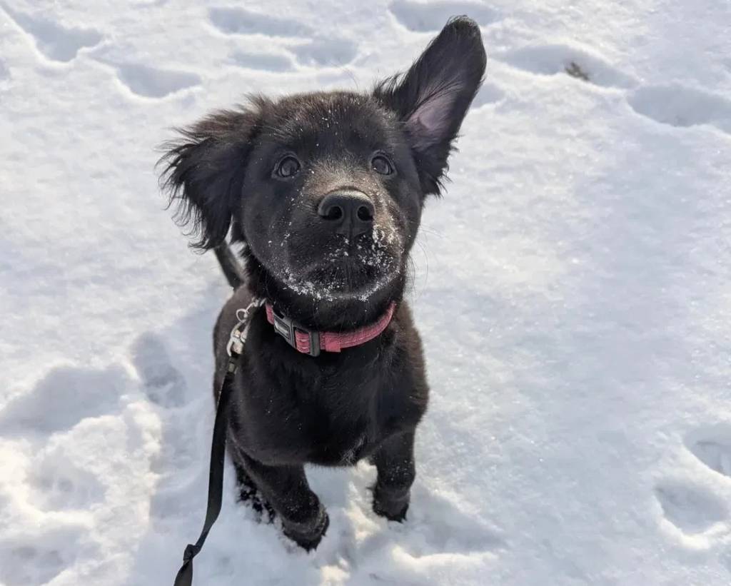 Un Goldador assis sur une surface enneigée et qui est tenu en laisse