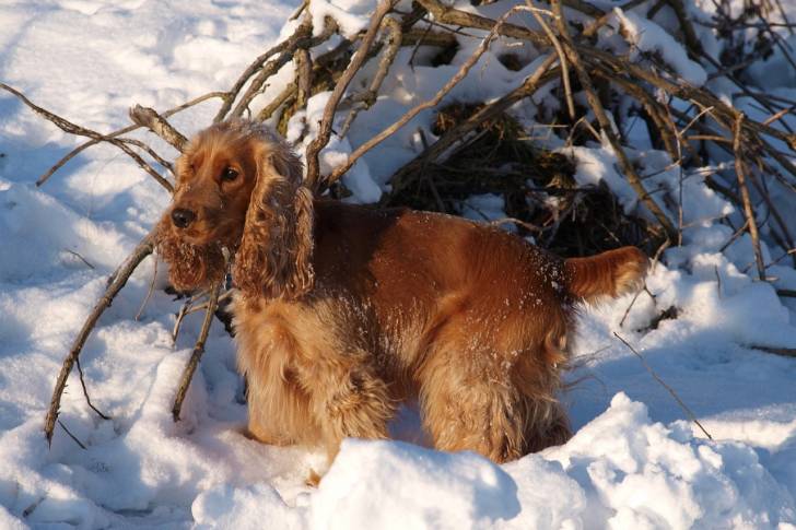 Un Golden Cocker Retriever à la robe unicolore fauve, marchant dans la neige