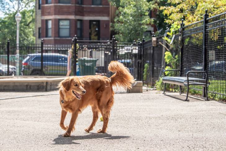 Un Golden Irish au pelage fauve, en mouvement dans un parc