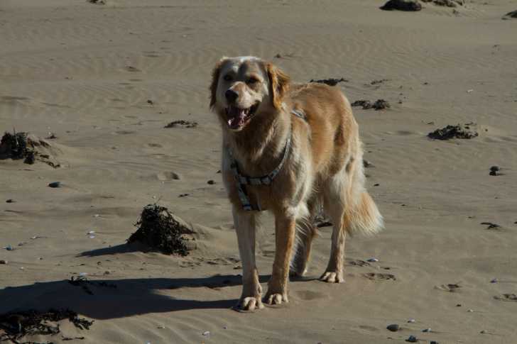Un Golden Irish au pelage fauve, marchant sur une plage