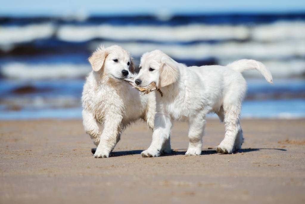 Deux chiots Golden Retriever jouant avec un poisson mort sur la plage