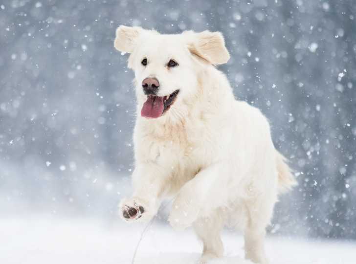 Un Golden Retriever blanc court dans la neige