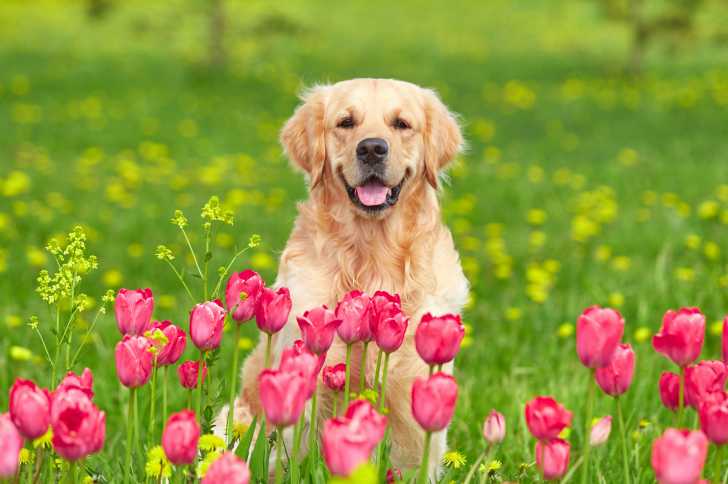 Un Golden Retriever assis derrière des coquelicots
