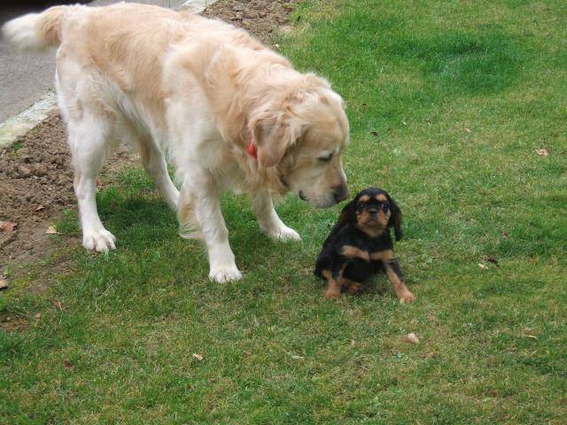 Première rencontre entre mes deux chiens. Le Golden "Ruben" a 8 ans et le Cavalier King Charles "Clyde" a 2 mois 1/2.