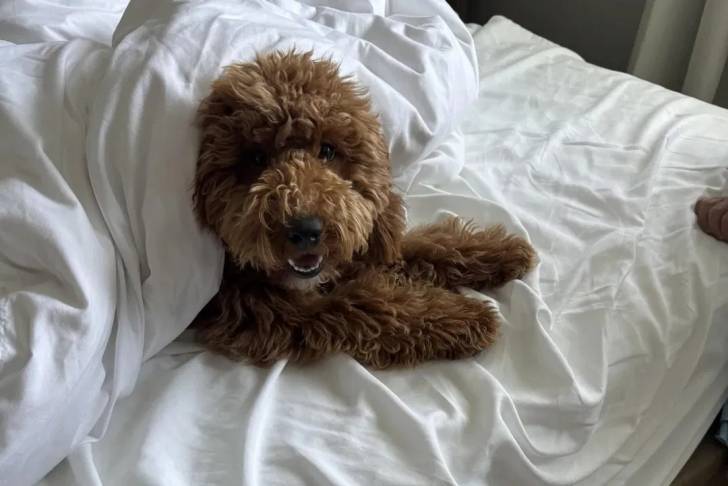 Un Goldendoodle allongé sur un lit et regardant vers la caméra