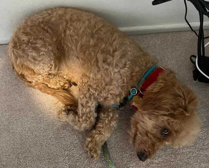 Un Goldendoodle allongé sur une moquette et portant un collier autour du cou