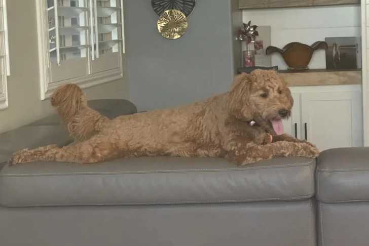 Un Goldendoodle allongé sur un canapé et ayant la langue pendante